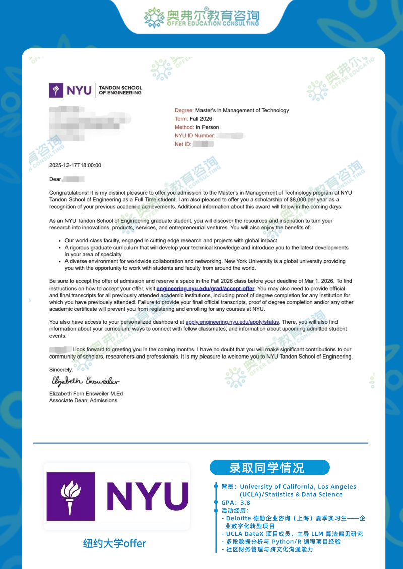 【26fall美研】UCLA 统计学姐斩获 NYU 科技管理硕士录取+$8000奖学金!