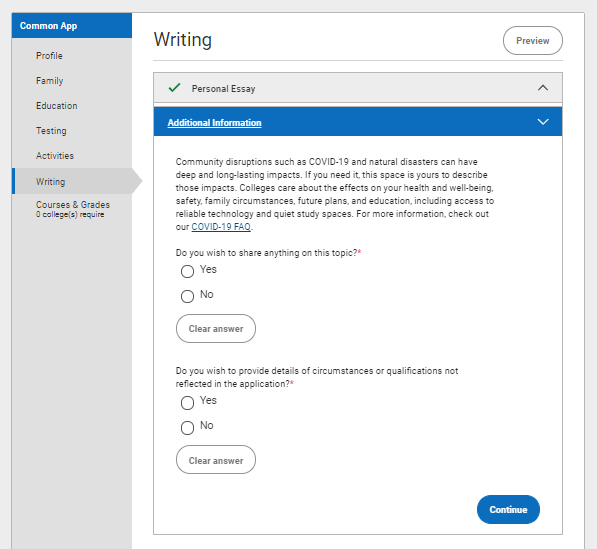 在左侧栏中可以看到七个分类的填写内容,分别是:Profile、Family、Education、Testing、Activities、Writing以及Courses & Grades(部分学校需要)。
